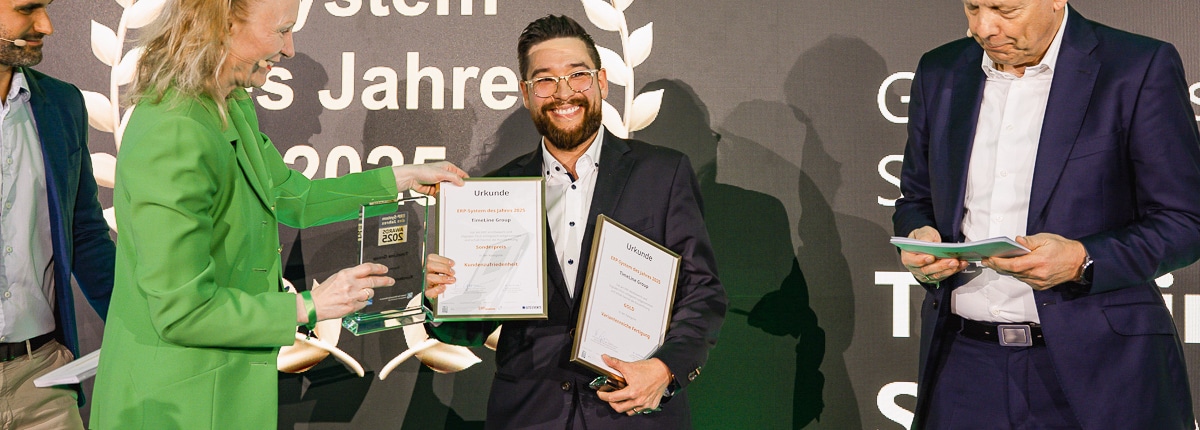 ERP-System des Jahres 2023 – Sieg in der Königsklasse Fertigung und Erhalt des Sonderpreises für Kundenzufriedenheit. Die diesjährige Preisverleihung fand wie auch vergangenes Jahr im Rahmen einer Award-Verleihung im Zentrum Industrie 4.0 in Potsdam statt und wurde zudem via Livestream übertragen. Boris Gebauer (Geschäftsführer) und Christian Salihin (Vertriebsleiter) waren Stellvertreter für die TimeLine Gruppe vor Ort.