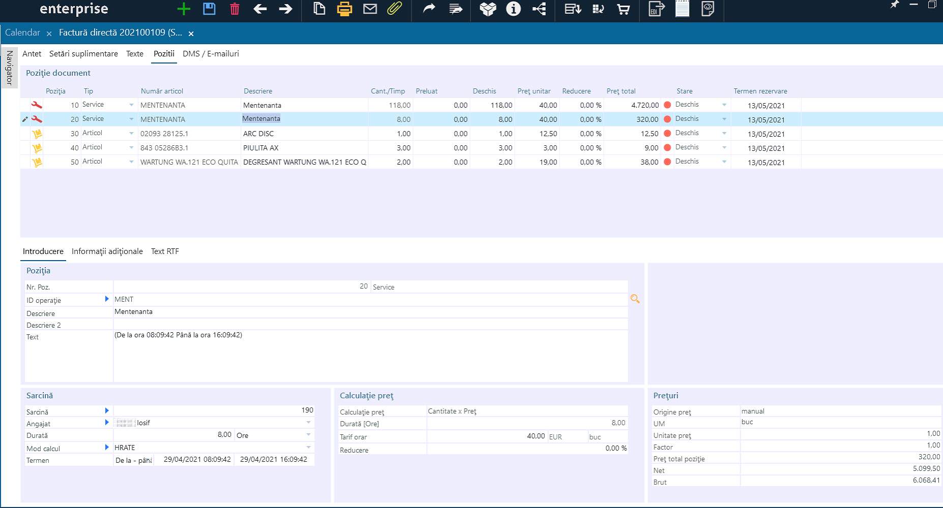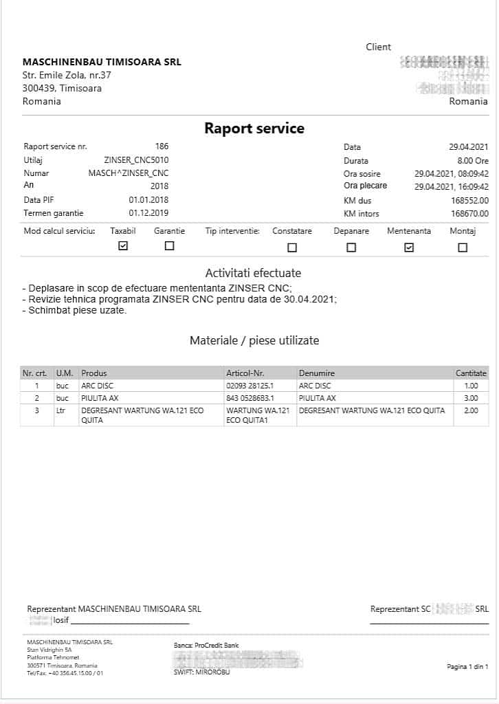 Dacă este realizată și o factură, se preia automat clientul asociat utilajului asupra căruia s-a intervenit iar costurile sunt defalcate în poziții corespunzătoare manoperei, kilometrilor efectuați și pieselor de schimb utilizate. Prețurile provin din nomenclatorul asociat respectivelor articole și servicii, iar ele pot fi generice sau stabilite pentru fiecare client în parte.